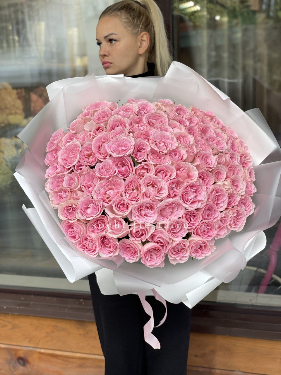 Сто одна роза пудрово-розового оттенка образует монохромное облако из бутонов. Классическая форма в современной подаче для тех, кто предпочитает говорить цветом без лишних слов.