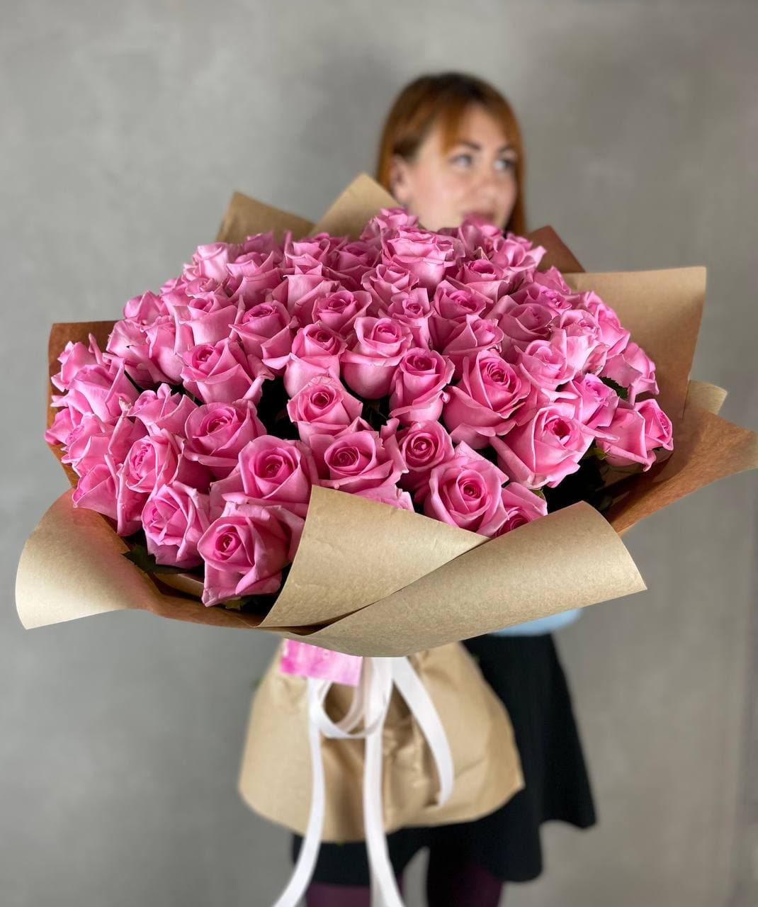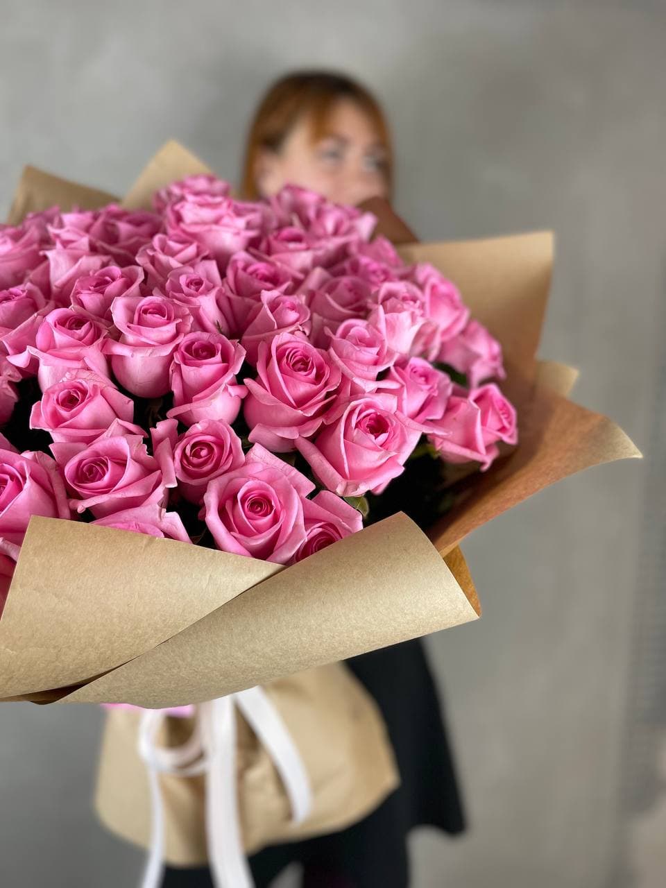 Тридцать одна роза образует пышное облако розового цвета с серебристыми нотами эвкалипта. Крафтовая обертка подчёркивает естественную красоту бутонов и создаёт ощущение лёгкости.