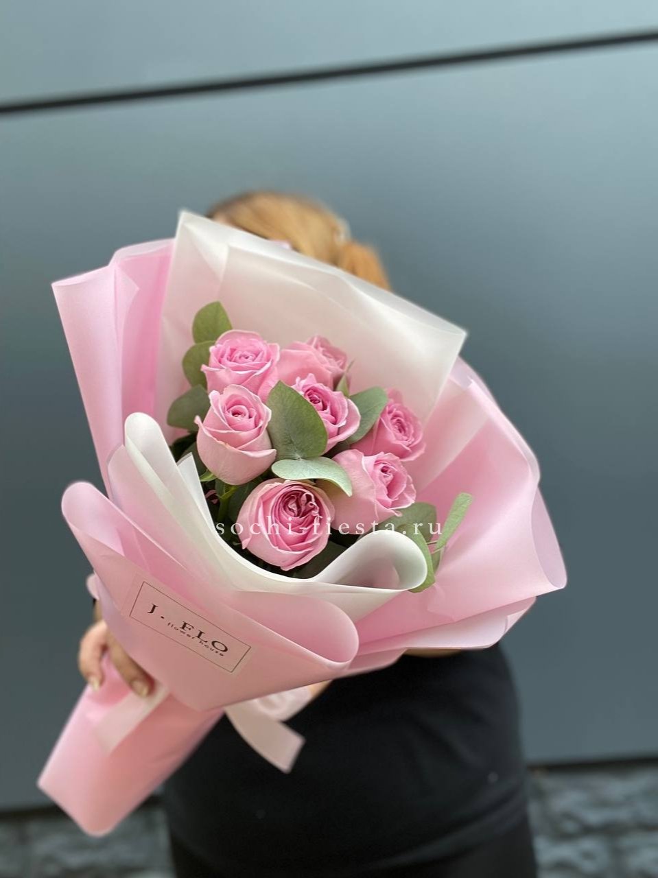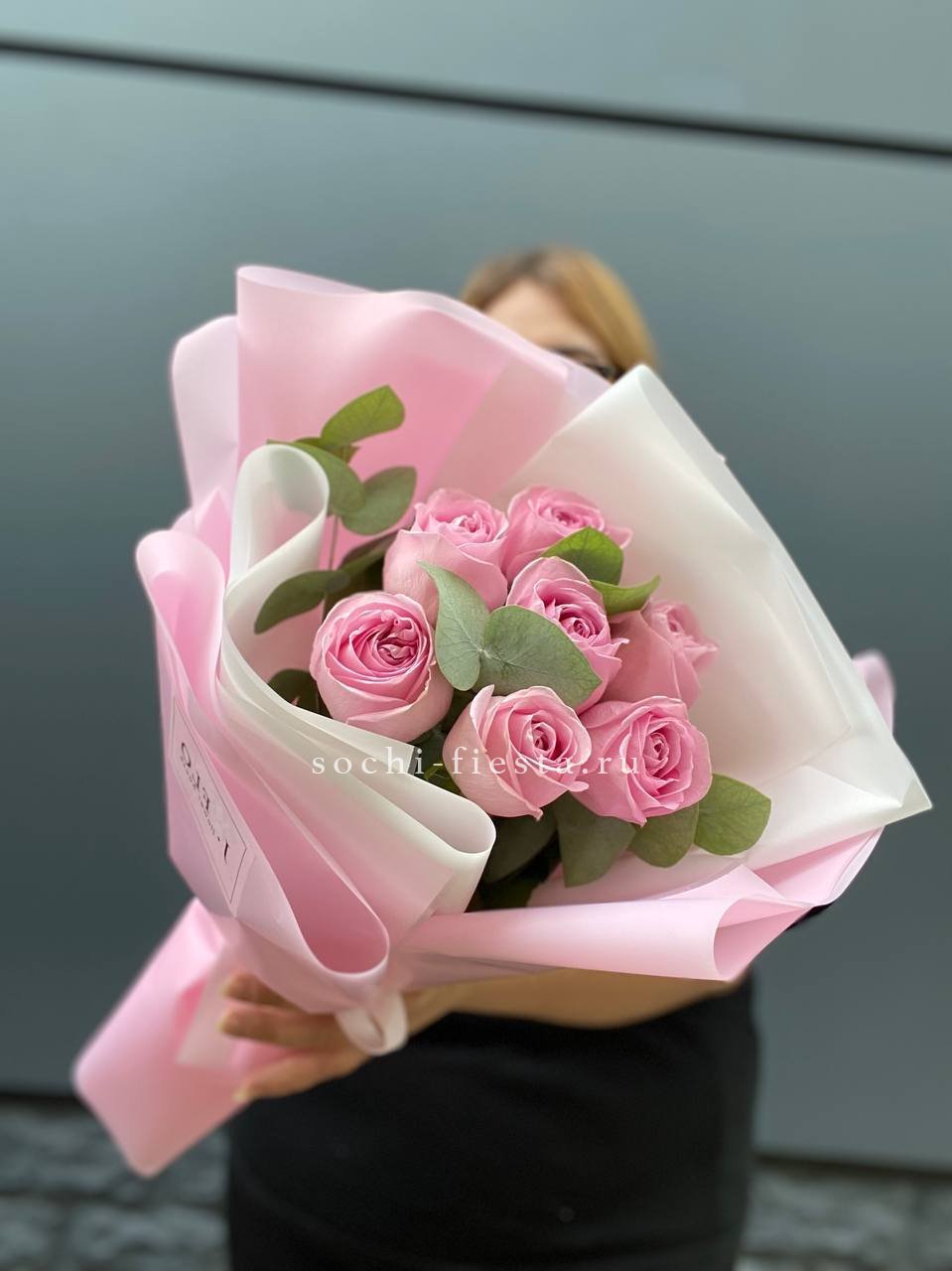 7 розовых роз с эвкалиптом