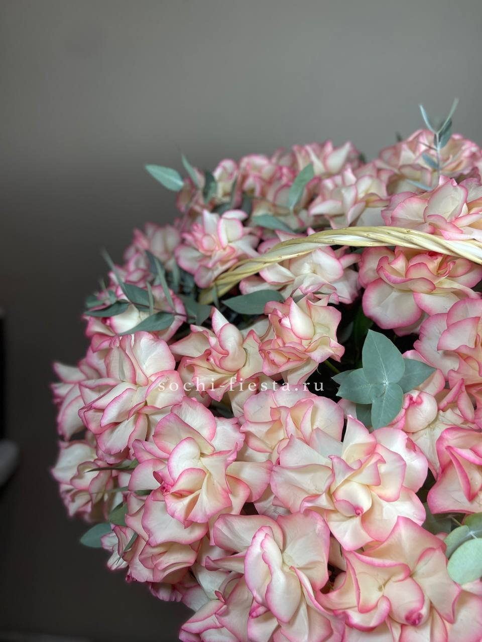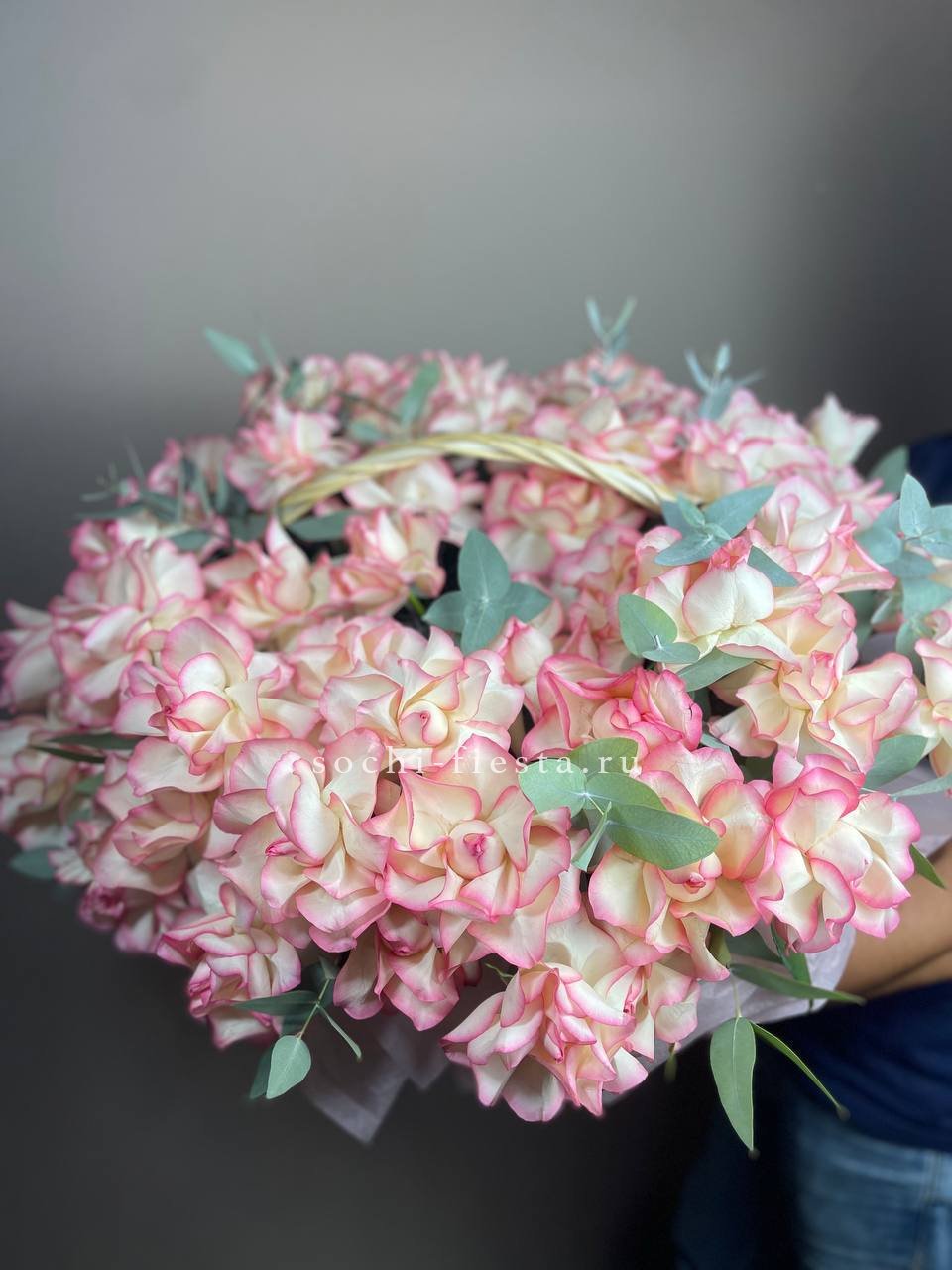 французские розы - 11 шт., эвкалипт-1шт, лента, авторская упаковка.