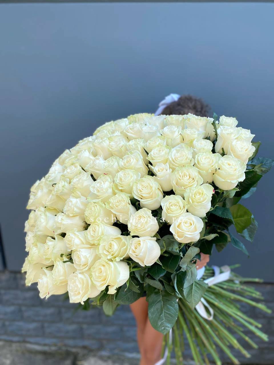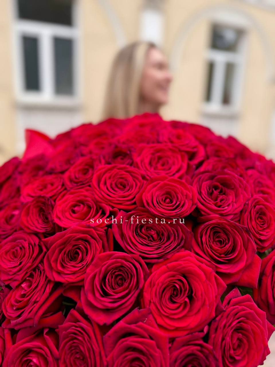 101 красная голландская роза (фридом или эксплорер), лента, упаковка на выбор.