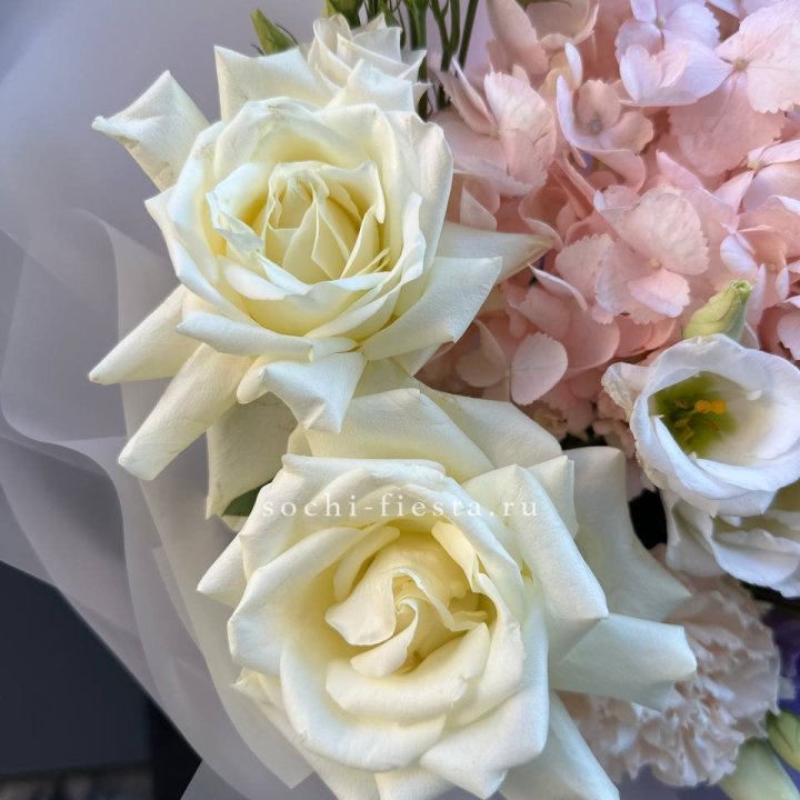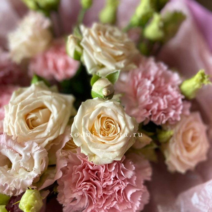 Основа сборных букетов в Улан-Удэ: розы (Freedom, Mondial, Avalanche), хризантема кустовая, альстромерия, эустома, фрезия, вероника. Дополнительно — ранункулюсы в сезон, хризантема одиночная, ирис весной, тюльпаны в апреле. Состав зависит от текущей поставки и сезона. Флорист всегда предлагает то, что в лучшей форме прямо сейчас.