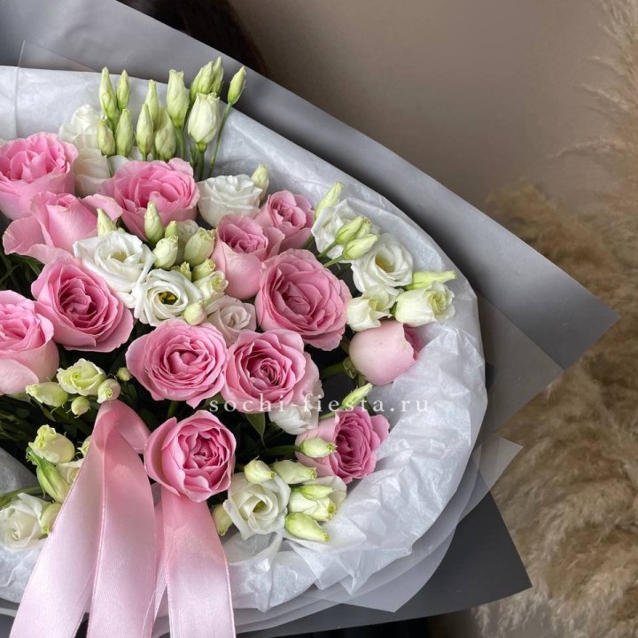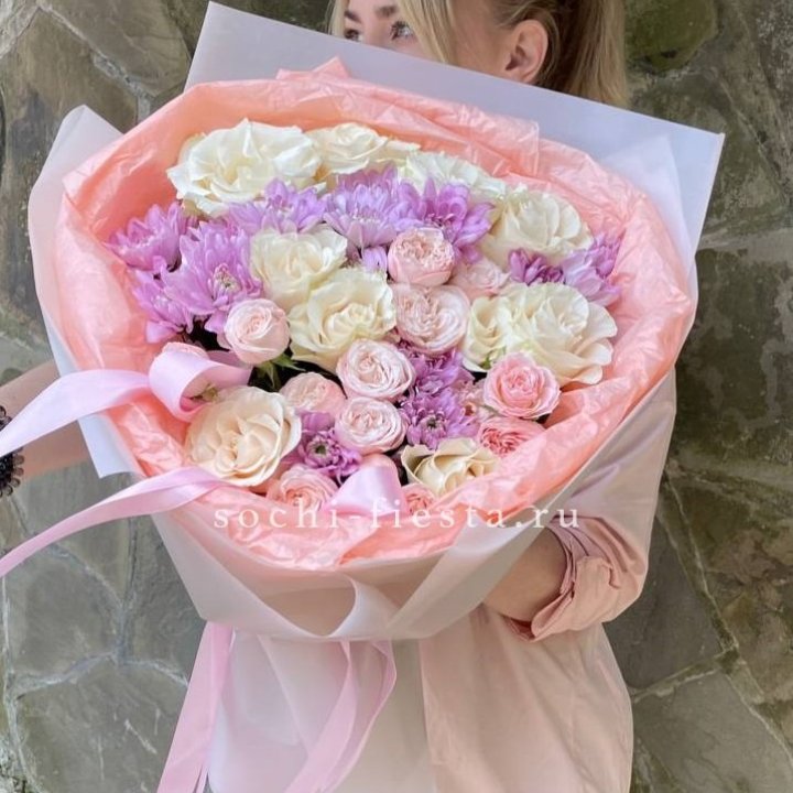 Основа сборных букетов в Улан-Удэ: розы (Freedom, Mondial, Avalanche), хризантема кустовая, альстромерия, эустома, фрезия, вероника. Дополнительно — ранункулюсы в сезон, хризантема одиночная, ирис весной, тюльпаны в апреле. Состав зависит от текущей поставки и сезона. Флорист всегда предлагает то, что в лучшей форме прямо сейчас.