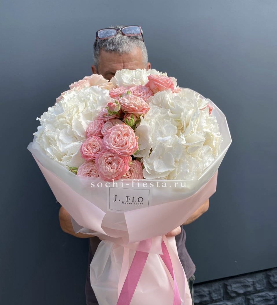 гортензия, кустовая роза, лента, упаковка.