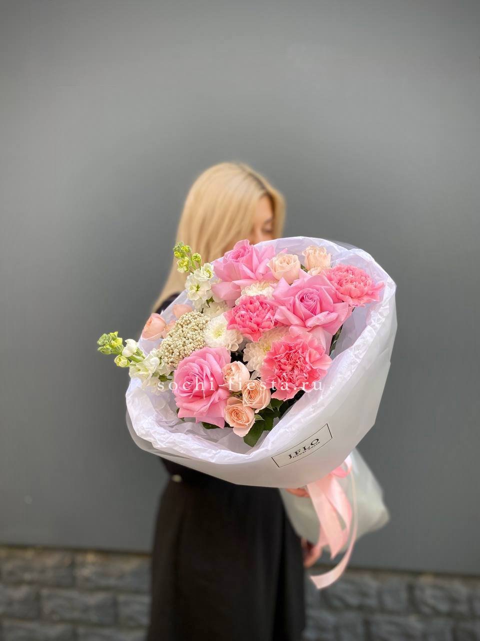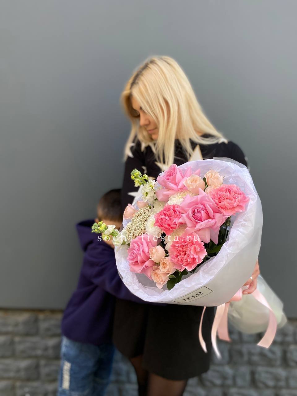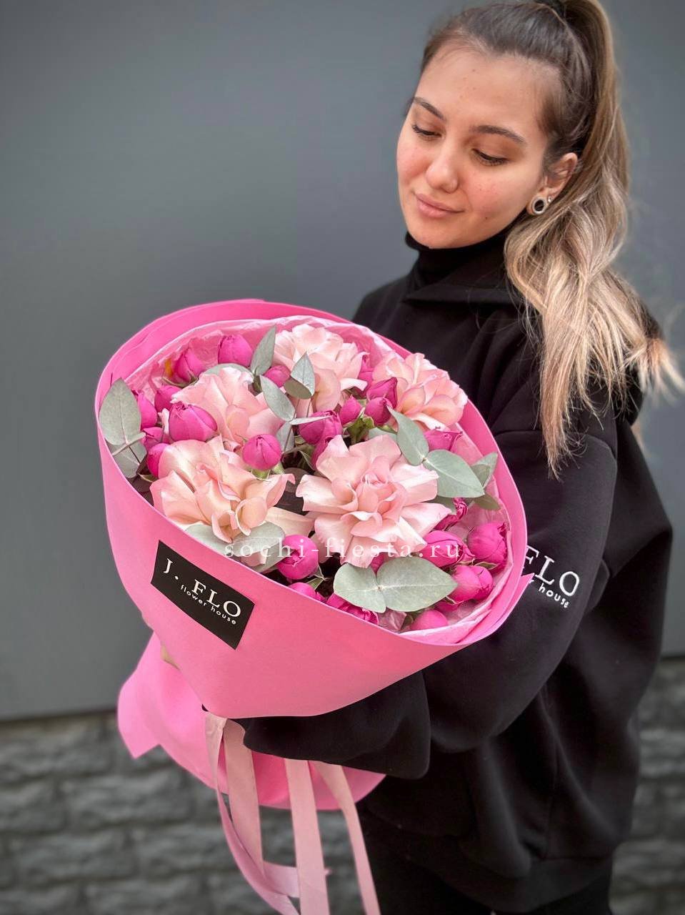 Пушистые шапки Мисти Бабблс переплетаются с классическими розовыми бутонами, создавая объёмный силуэт с мягкими переходами. Композиция собрана плотно, каждый цветок занимает своё место в общем ритме.