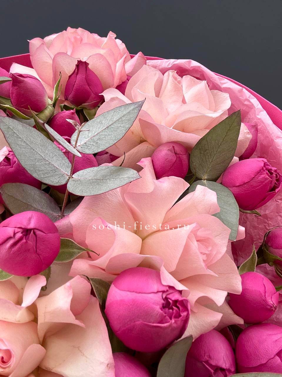 пионовидные кустовые розы мисти бабблс, розовые розы, лента, дизайнерская пленка, тишью.