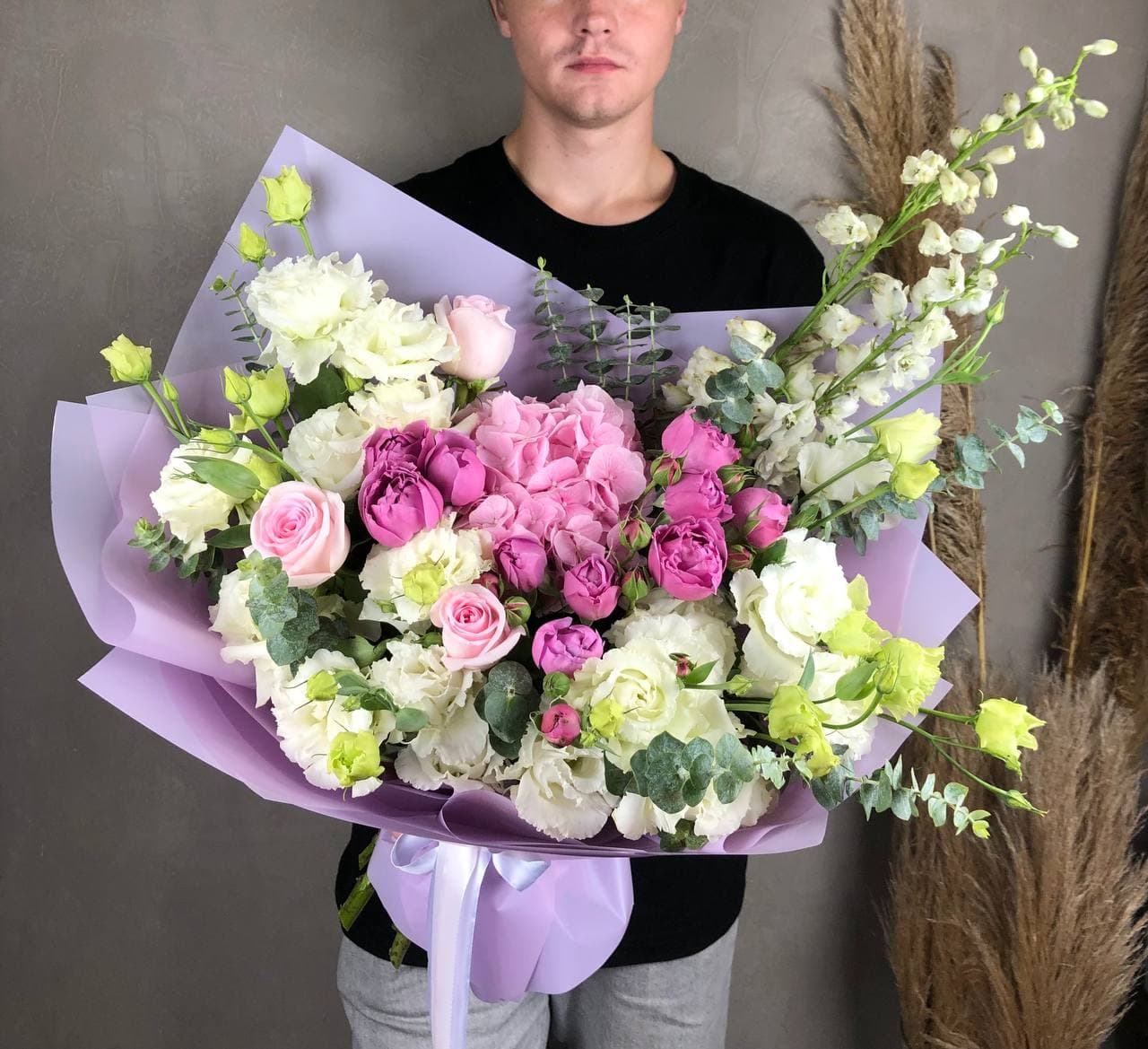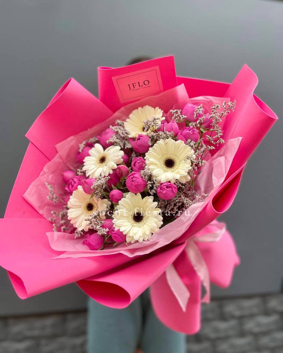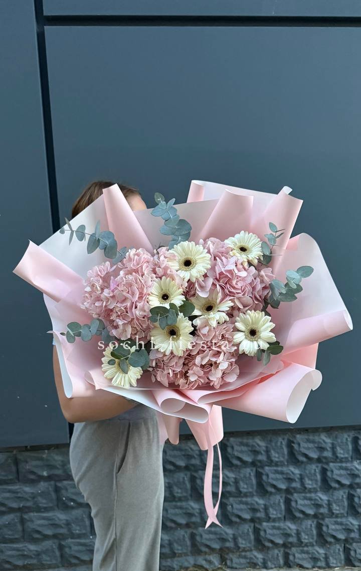 Плотная сборка с пышными соцветиями гортензии и яркими герберами создает объемный силуэт. Маттиола и лимониум добавляют воздушности по краям, а диантусы заполняют центр мягкими переходами.