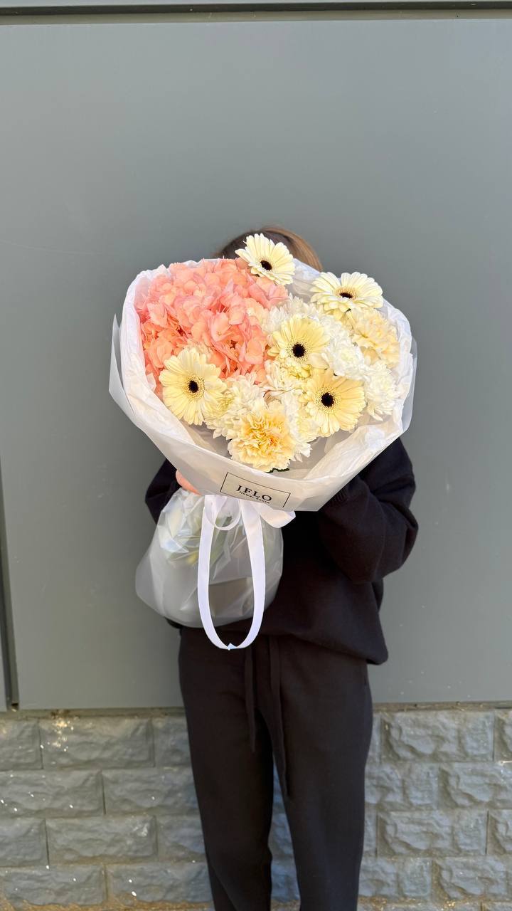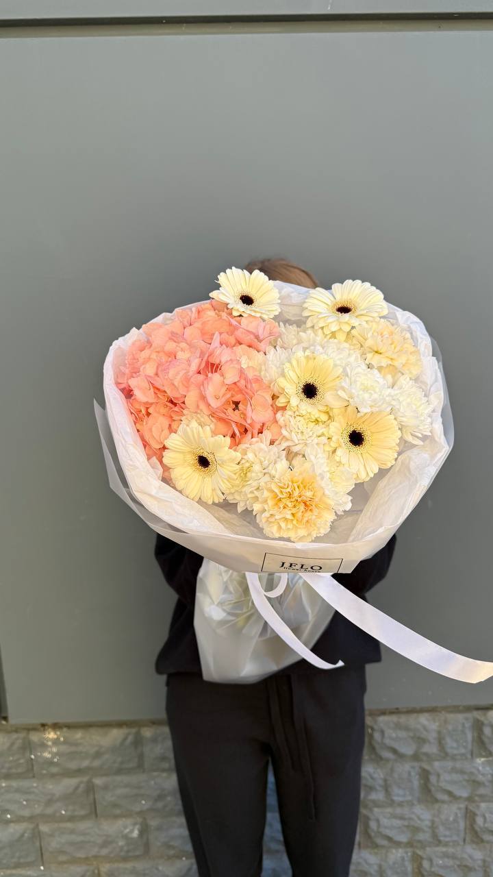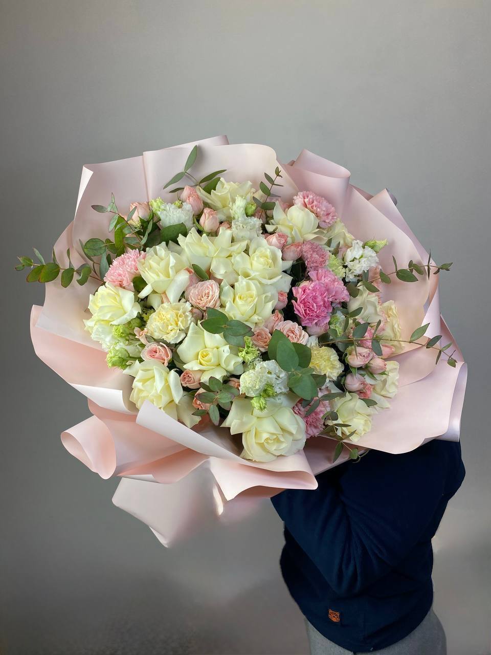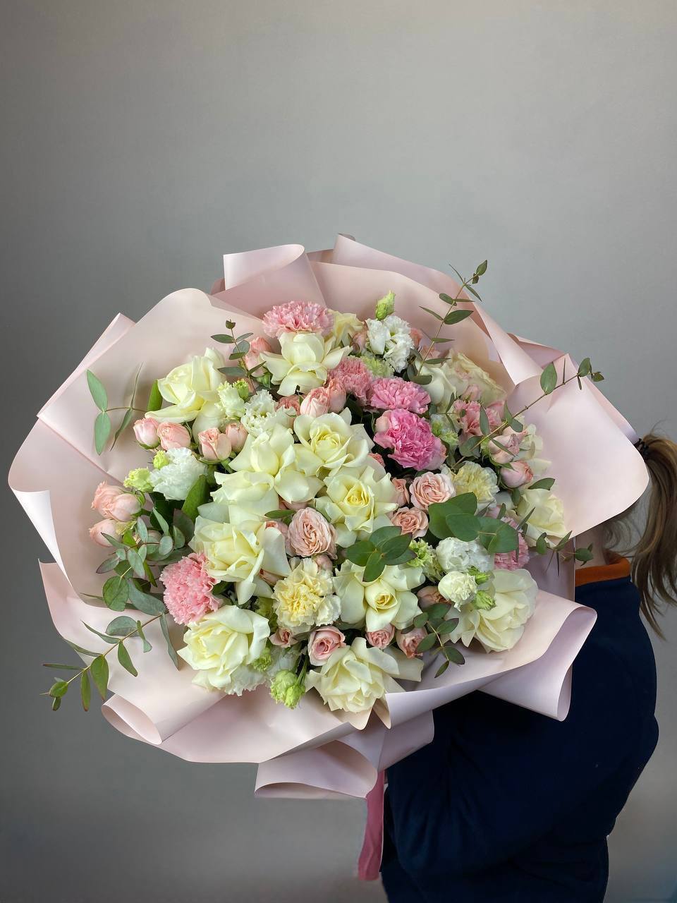 Монохромная палитра с многослойной структурой. Французские розы и эустомы чередуются с кустовыми бутонами, гортензии заполняют объём, а диантусы создают точечные акценты. Букет выглядит цельно и графично.