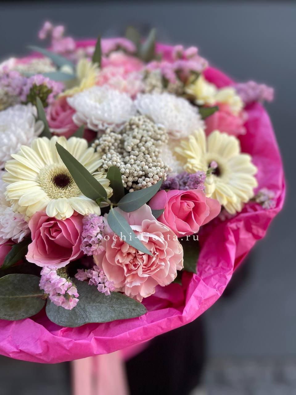 Пышный микс из гербер, хризантем и роз в обрамлении диантуса и статицы. Букет собран плотно, с яркими акцентами по всей форме. Озатамус и эвкалипт добавляют глубину и завершенность композиции.