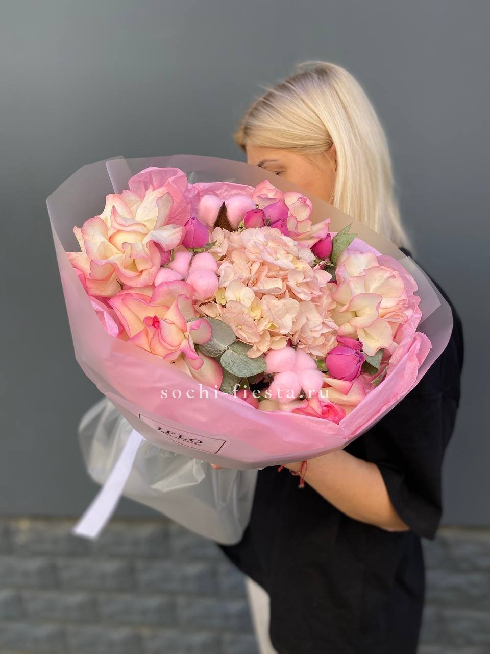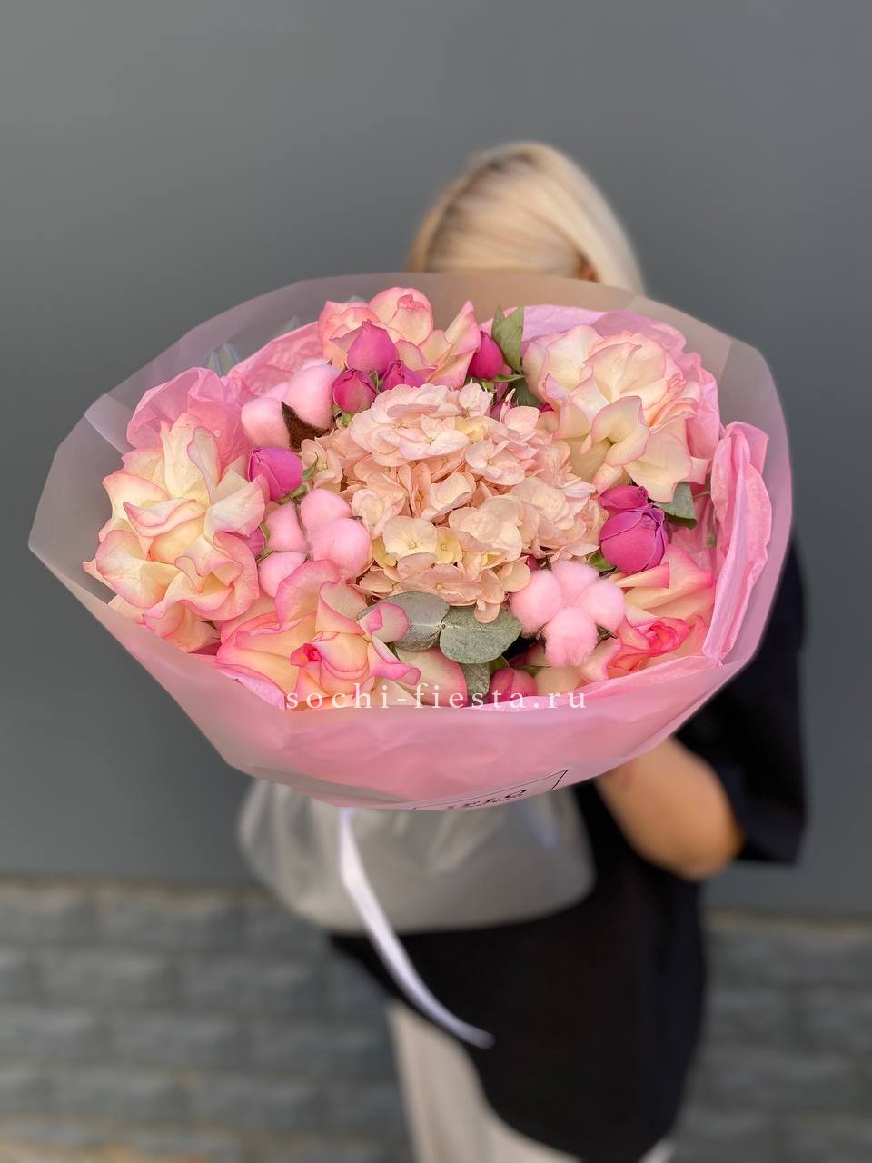 Крупные бутоны Джумилии соседствуют с воздушной гортензией и россыпью кустовых роз. Эвкалипт и хлопок создают спокойный фон для нежной палитры.