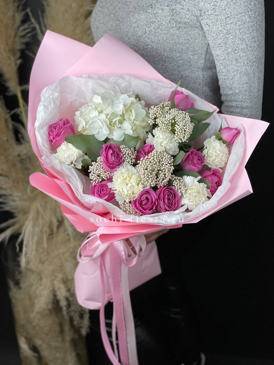 розовая гортензия, белые ирисы (или эустома), лента, дизайнерская упаковка.