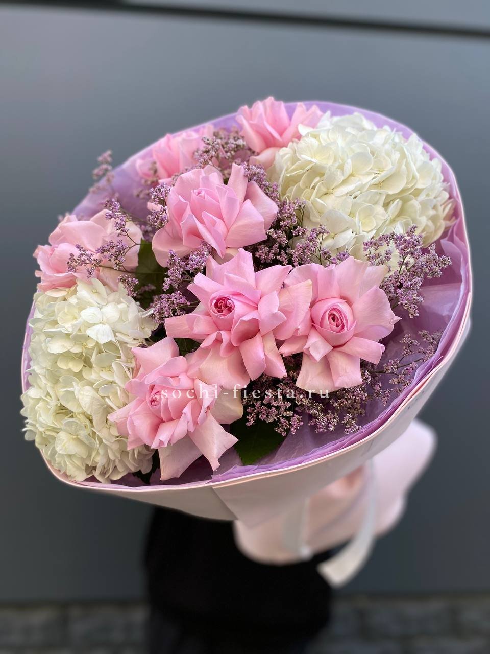 Букет с гортензией и белыми французскими розами