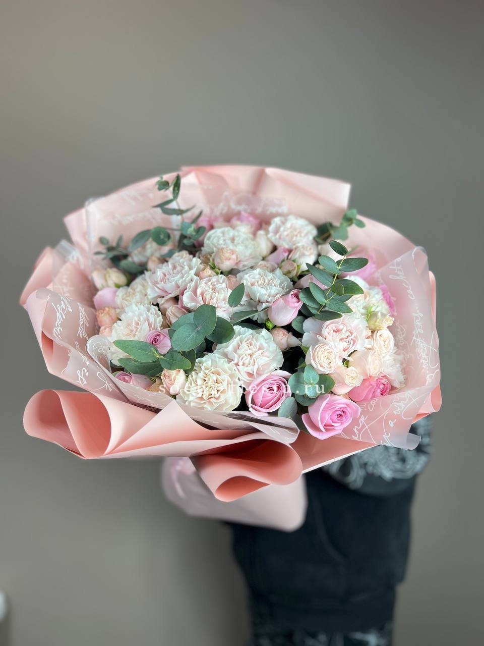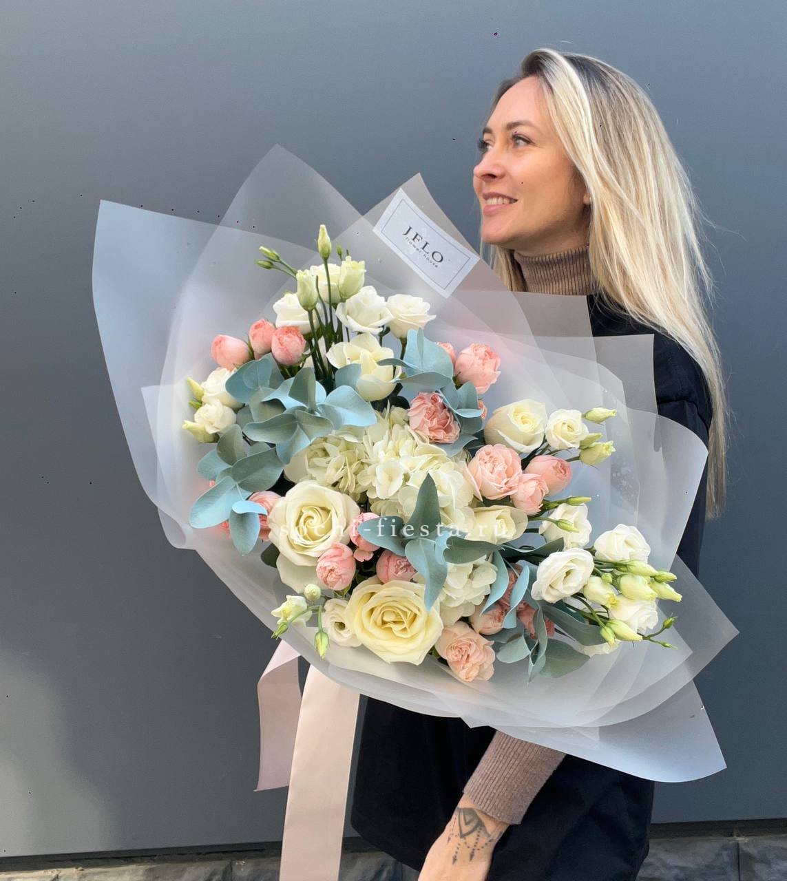 Lucrecia собрана из пионовидных и классических роз с добавлением пушистых кустовых хризантем. Букет легко впишется в современный интерьер и поддержит спокойную эстетику пространства.