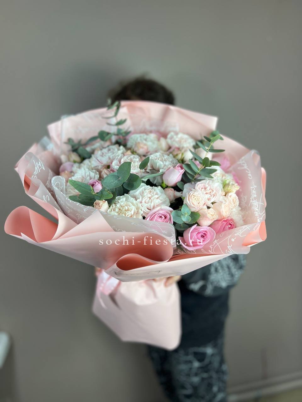 хризантемы кустовые, пионовидные розы, одноголовые розы, лента, дизайнерская упаковка.