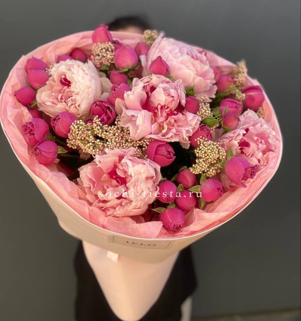 Пионы раскрыты полностью, их лепестки создают объёмную текстуру. Кустовые розы добавляют плотности, а озатамус заполняет промежутки мелкими соцветиями. Композиция выглядит пышно и живо.