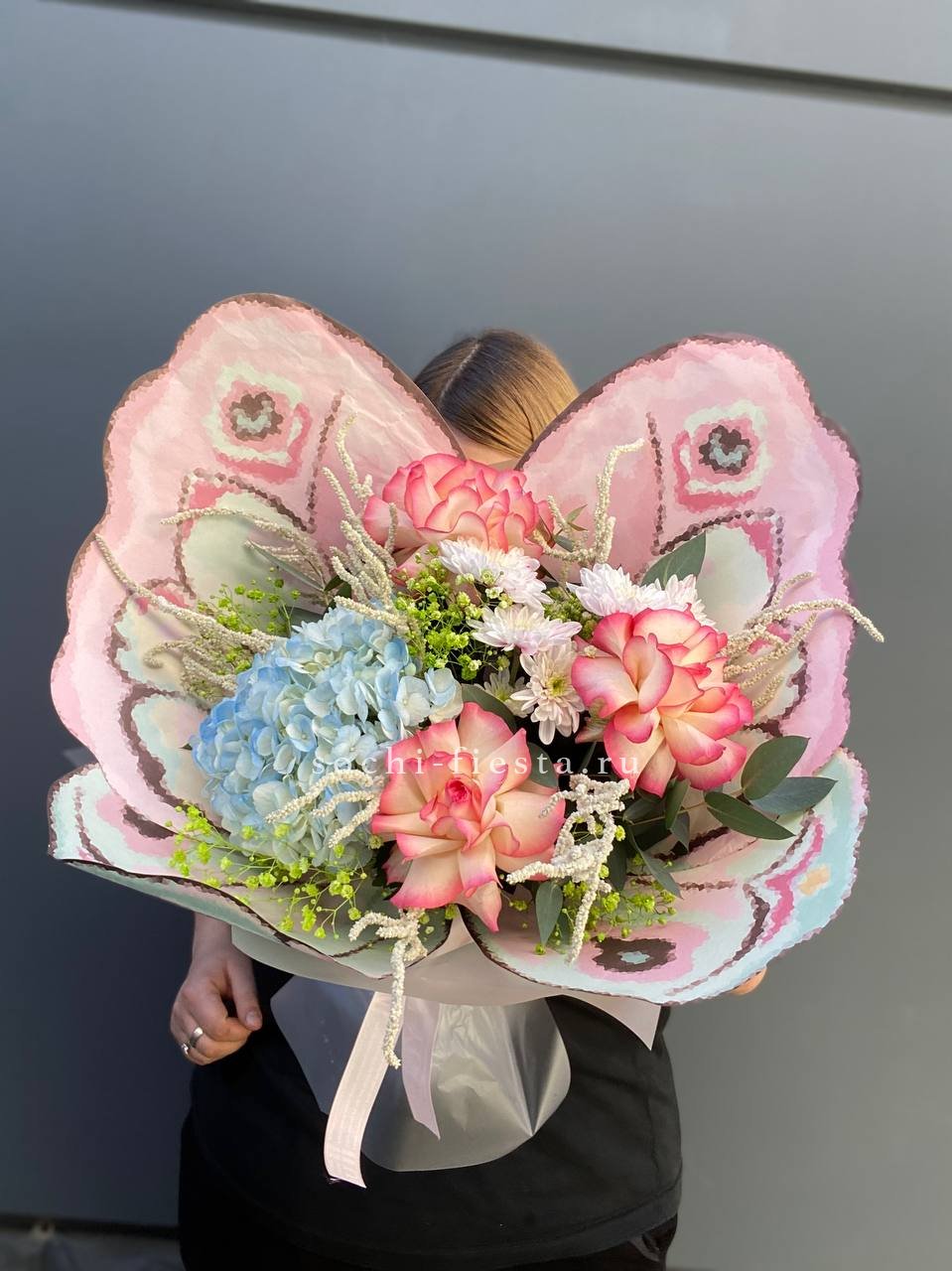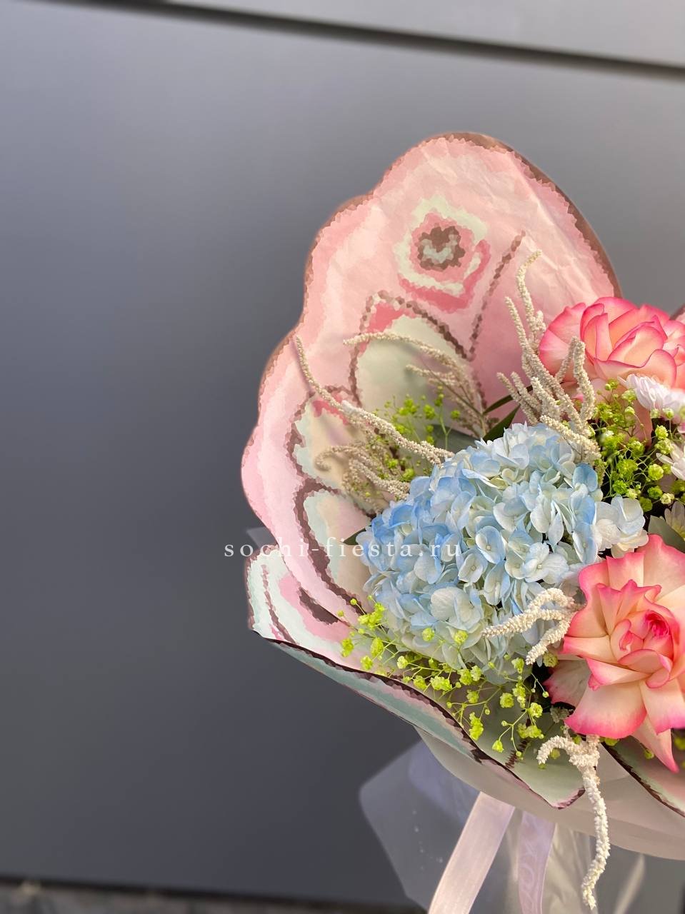 розовые розы, сирень, эвкалипт, лента, авторское оформление.