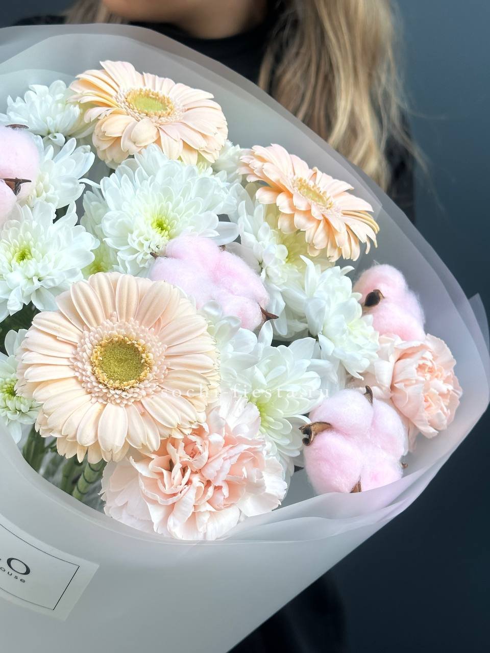 Яркая композиция собрана из гербер, роз Джумилия и воздушной гортензии. Диантус и озотамнус добавляют фактурности, создавая объёмный силуэт с живописной глубиной.
