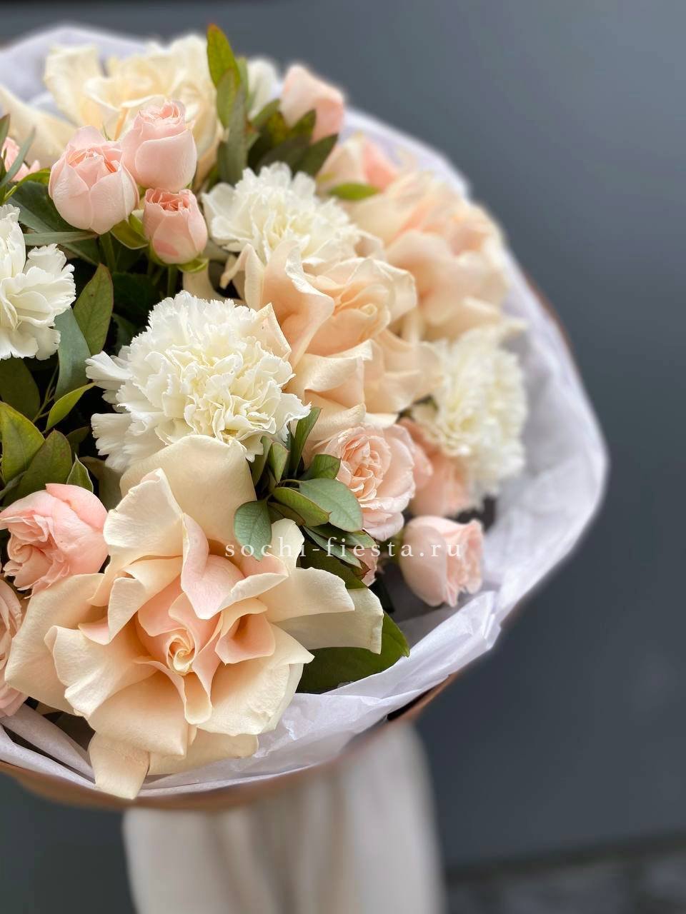 Кремовые и кустовые розы образуют спокойную цветовую гамму с тёплым подтоном. Диантусы добавляют объём, а эвкалипт вносит свежие нотки в общую картину.