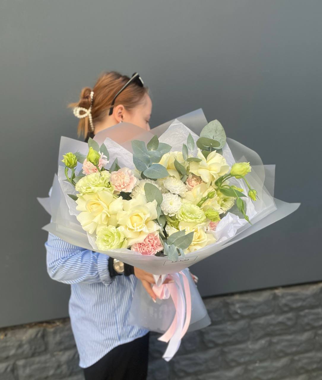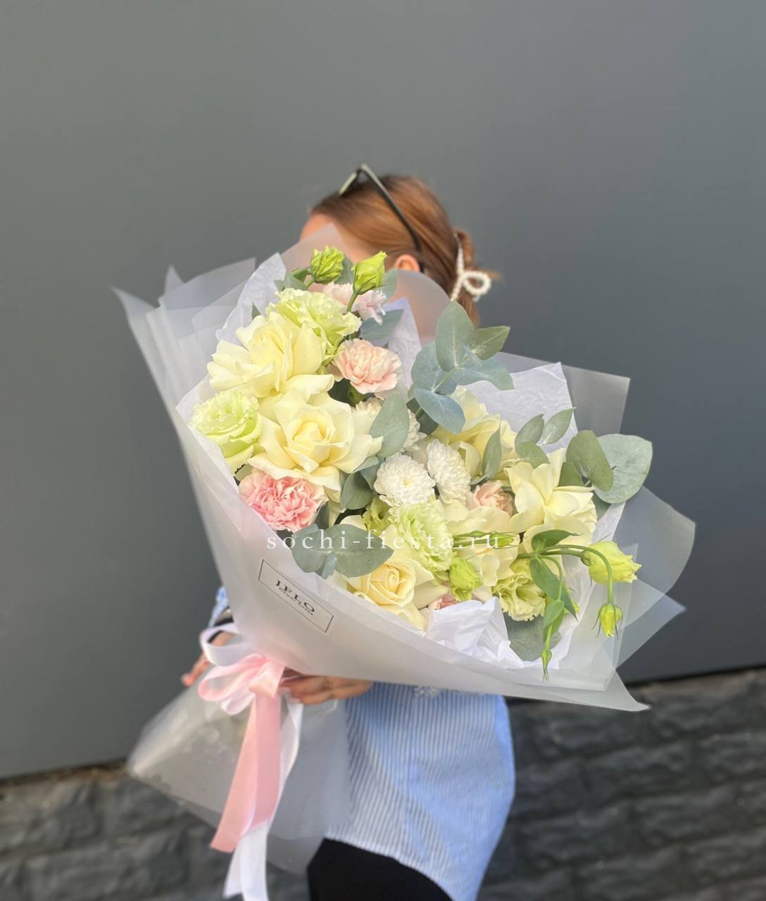 диантус, эустома, хризантема, белая роза, эвкалипт, упаковка.