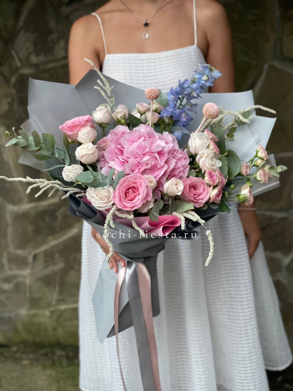 гортензия, розы, эустома, кустовая пионовидная роза, эвкалипт, лента, дизайнерская упаковка.