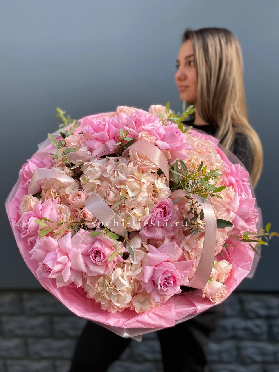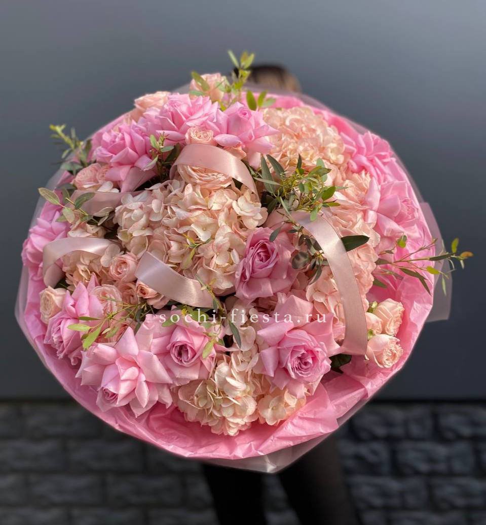 диантусы, розы, эустома, гортензия, эвкалипт, вспомогательные цветы, лента, корейская пленка.