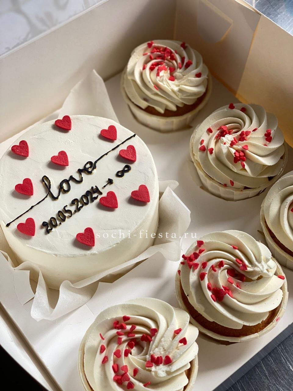 Пять капкейков окружают центральный торт с узнаваемой надписью Lovely. Крем разных оттенков добавляет динамику, а общий объём набора впечатляет сразу. Формат для компании или щедрого жеста.