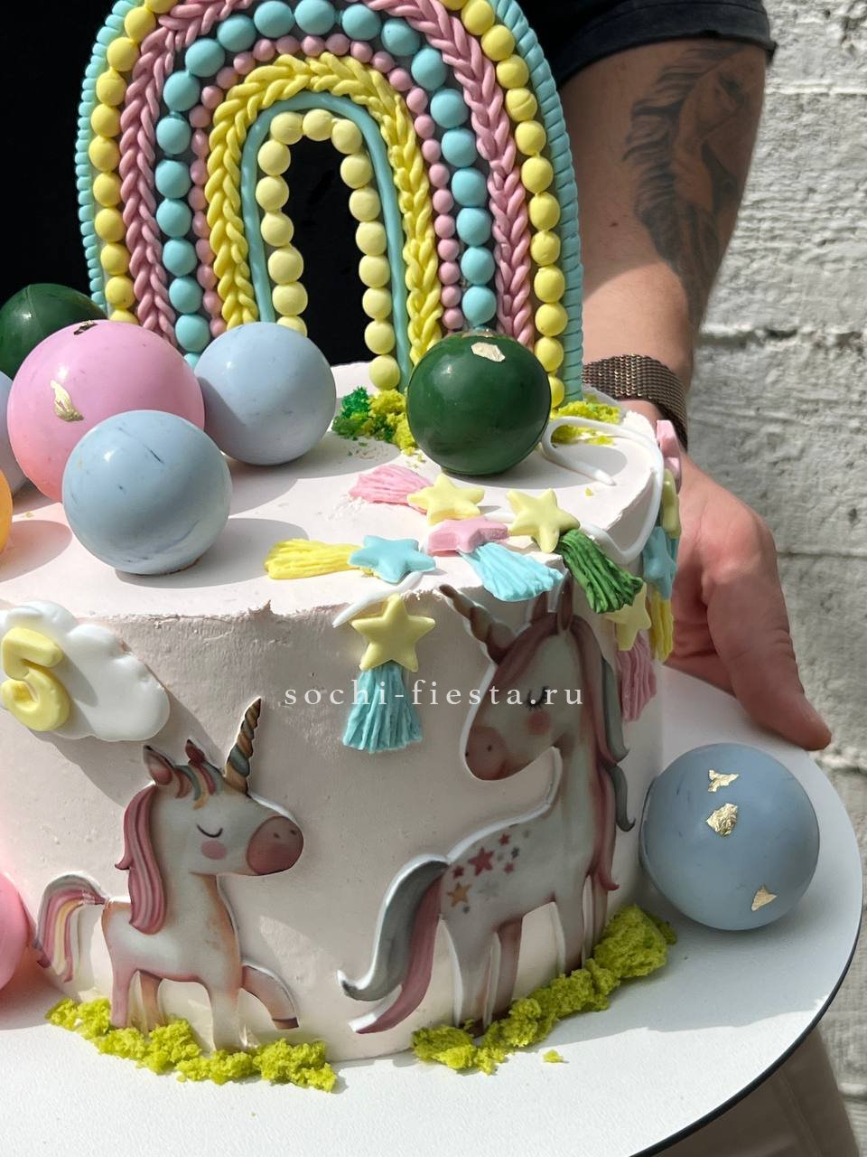Яркие слои бисквита и крема образуют радужный градиент, а сверху композицию завершает фигурка единорога. Каждый ярус раскрывает новый вкус, превращая угощение в красочное приключение для именинника и гостей.